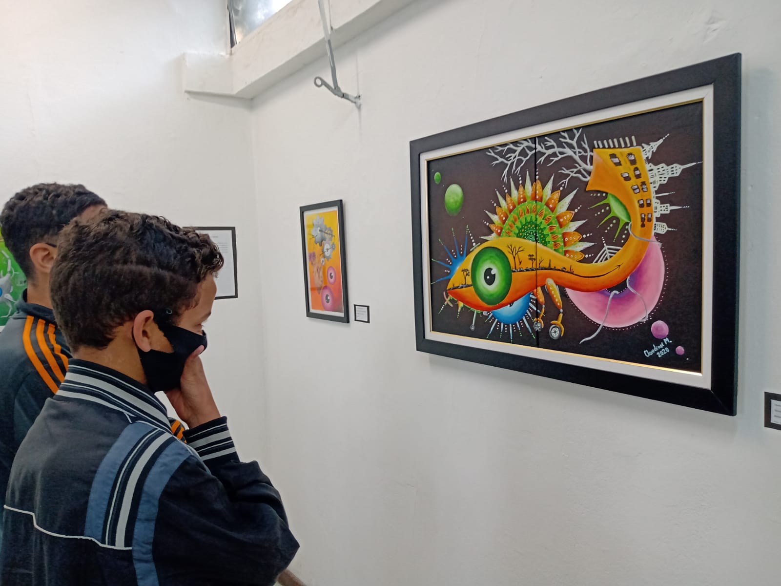 Durante a visitação da turma, as alunas Ingrid Araújo de Souza, 15 anos, e Larissa Marilin, 14 anos, dedicavam alguns grafites ao painel disponível aos visitantes. “Fiquei com muita vontade de vir, fotografar, já acompanho o trabalho do professor Claudinei desde 2014”, conta Larissa. Já Ingrid demonstra grande alinhamento com as artes visuais: “na parte digital, fanart e crio personagens; mexo também com aquarela e guache, conta.