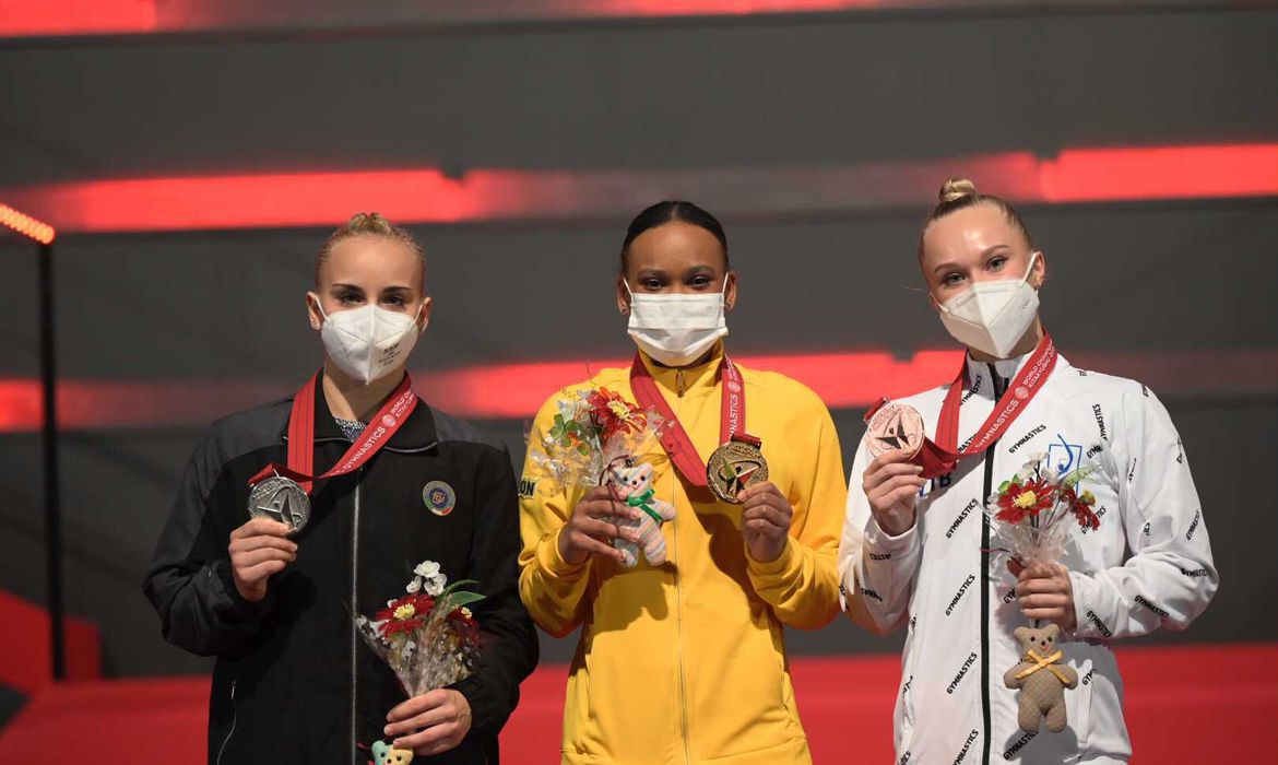 A ginasta, de 22 anos, sobrou no salto sobre a mesa, assim como já fizera nos Jogos de Tóquio, que resultou no ouro.  Rebeca foi às alturas nos dois saltos da final – um Cheng (15,133) e um Yurchenko (14,800) – totalizando 14,966, deixando para trás a italiana Asia D’Amato (14,083) e a russa Angelina Melnikova (13,966).