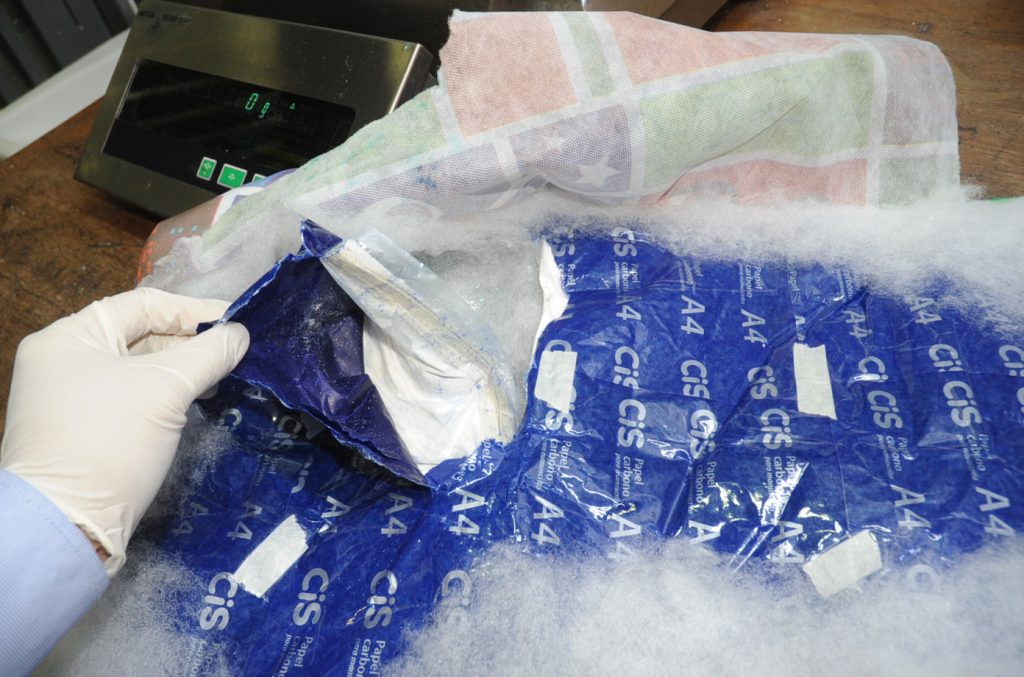 Servidores da Receita Federal, que atuam na fiscalização de bagagens despachadas, identificaram, por meio das imagens do aparelho de raio-x, material suspeito no interior de uma mala que seria introduzida em voo para Lisboa, em Portugal. O passageiro, um brasileiro de 33 anos de idade, foi localizado no interior da aeronave e conduzido a uma sala reservada para que, na presença de testemunhas, sua bagagem fosse revistada. Dentro da mala foram encontradas 7 embalagens com peças de tecido, semelhantes a edredons, contendo, sob as espumas, pacotes envoltos em fita adesiva e papel carbono, com um pó, que foi testado, com a utilização de um reagente químico e ficou azulado, reação típica à droga cocaína. O homem foi detido e conduzido à PF onde foi preso, após os exames confirmarem que a substância era cocaína, cujo volume, contido nos 71 pequenos saquinhos, somou mais de 7 Kg.