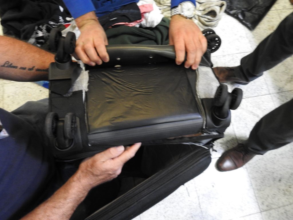 Policiais federais, em fiscalização de rotina junto aos passageiros que realizavam o check-in, entrevistaram e selecionaram duas pessoas, que aparentavam nervosismo, para entrevista. Um brasileiro, de 29 anos de idade, que pretendia realizar o check-in para embarcar em voo com destino a Lisboa, em Portugal, demonstrou muito nervosismo ao responder às perguntas dos policiais e foi conduzido, com seus pertences, para fiscalização indireta por meio do raio-x. Na mala de viagem foi observada a existência de material suspeito em suas estruturas. Na delegacia, desmontada a mala na presença de testemunhas, foram encontrados 4 Kg de cocaína em fundos falsos. O suspeito foi preso em flagrante.