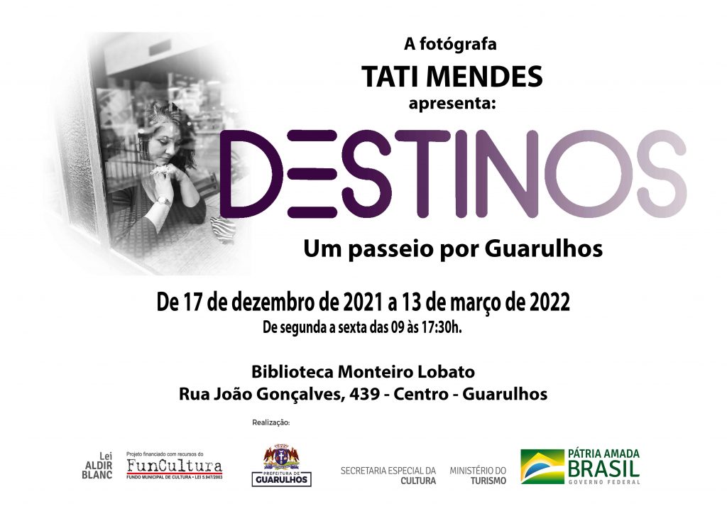 Fotos de locais em Guarulhos, imagens que buscam se relacionar de alguma maneira com um dos significados do termo destino. Entre os dias 17 de dezembro e 13 de março de 2022, de segunda a sexta-feira das 9h às 17h30, o salão de exposições da Biblioteca Monteiro Lobato apresenta Destinos, mostra fotográfica da artista Tati Mendes. A entrada é gratuita e a classificação é livre. A abertura da exposição acontece nesta quinta-feira (16), às 19h.