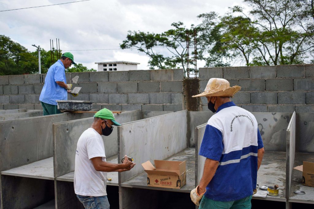 As unidades são feitas com peças de ardósia pré-moldadas que se encaixam para formar lóculos sobrepostos sobre um radier (laje de concreto armado em contato direto com o terreno). O projeto conta também com sistema de tratamento de efluentes gasosos com filtro de carvão ativado. Além de baixar os custos e facilitar o sepultamento, a verticalização amplia significativamente a capacidade do terreno. O trabalho é realizado por servidores do Departamento de Serviços Funerários de Guarulhos e deve ser finalizado em até 90 dias.