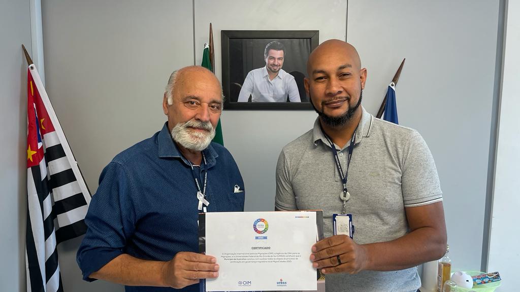 A Prefeitura de Guarulhos recebeu na tarde desta quinta-feira (16), pelo segundo ano consecutivo, o Selo MigraCidades-2021, premiação da agência das Nações Unidas para as Migrações (OIM) e da Universidade Federal do Rio Grande do Sul entregue aos governos locais que participaram com sucesso de todas as etapas previstas no projeto MigraCidades: Aprimorando a Governança Migratória Local no Brasil. Ao todo foram certificados nesta segunda edição 32 municípios e nove estados das cinco regiões do país.