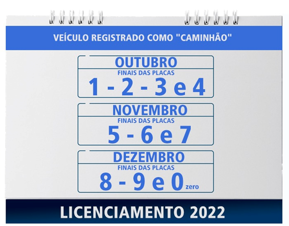 Por exemplo: donos de veículos com placas terminadas em 1 e 2 devem regularizar a documentação até o dia 31 de julho de 2022. O calendário vai de julho a dezembro – exceto para caminhões e tratores, que têm prazos entre outubro e dezembro.