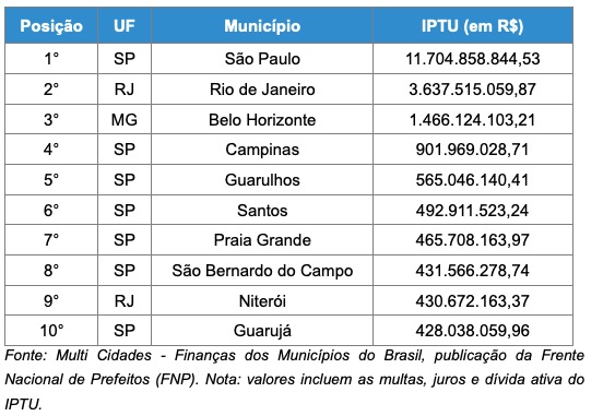 Em 2020, Guarulhos tinha a 9ª maior arrecadação do Imposto Predial e Territorial Urbano (IPTU) do Brasil com um total de R$ 565 milhões. O levantamento é do anuário Multi Cidades – Finanças dos Municípios do Brasil, da Frente Nacional dos Prefeitos (FNP) com patrocínio da Huawei e da Tecno It, divulgado nesta segunda-feira (17).