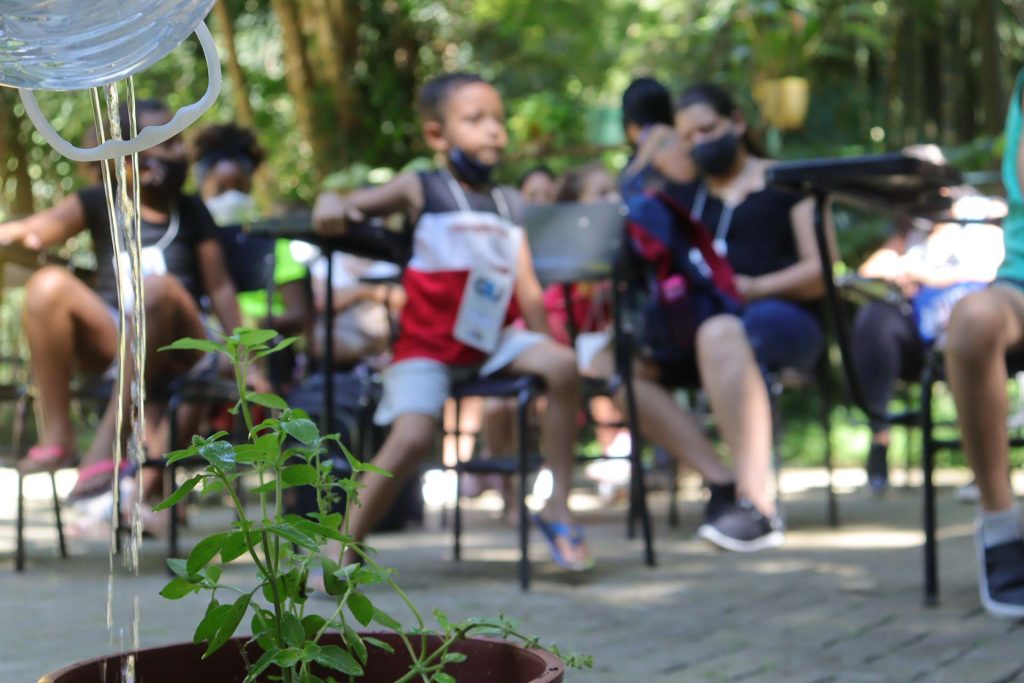 Durante a atividade, os educadores ambientais da Prefeitura de Guarulhos ensinaram a cultivar espécies de plantas que servem de alimento utilizando materiais reciclados, como vasos.