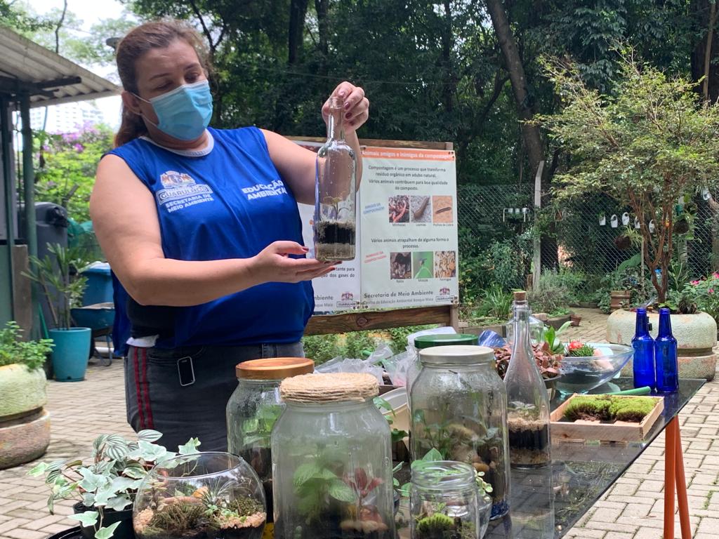 A Agenda Ambiental de fevereiro preparada pela Prefeitura de Guarulhos oferece oficinas rápidas de 60 minutos que ensinam a fazer peças que podem servir para decorar a casa, o escritório ou ainda como fonte de renda alternativa. Uma delas é a Terrário, que consiste de um minijardim feito com reaproveitamento de embalagens, como potes de vidro, entre outros materiais.