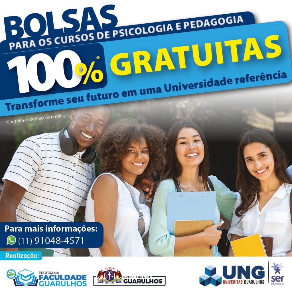 A Universidade de Guarulhos (UNG) é uma das instituições credenciadas pelo Programa Faculdade Guarulhos para ofertar 100 bolsas de estudos de 100% à população guarulhense de baixa renda. Serão disponibilizadas 50 vagas para o curso de Pedagogia e 50 para Psicologia.