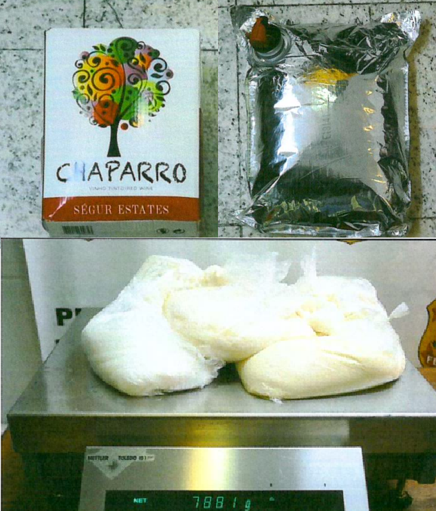 Policiais federais, que fiscalizavam os passageiros na fila do check-in, abordaram para entrevista uma passageira que estava acompanhada de sua filha, de 7 anos de idade. Em razão de suspeitas, ela teve suas malas submetidas ao aparelho de raio-x, momento em que os policiais perceberam substância orgânica compactada dentro de sete volumes. A mala da passageira foi aberta e, dentro de sete embalagens de vinho em caixa, os policiais encontraram quase oito quilos de cocaína. A suspeita, uma brasileira de 30 anos de idade, recebeu voz de prisão e será apresentada à Justiça Federal. A menor foi encaminhada ao conselho tutelar.
