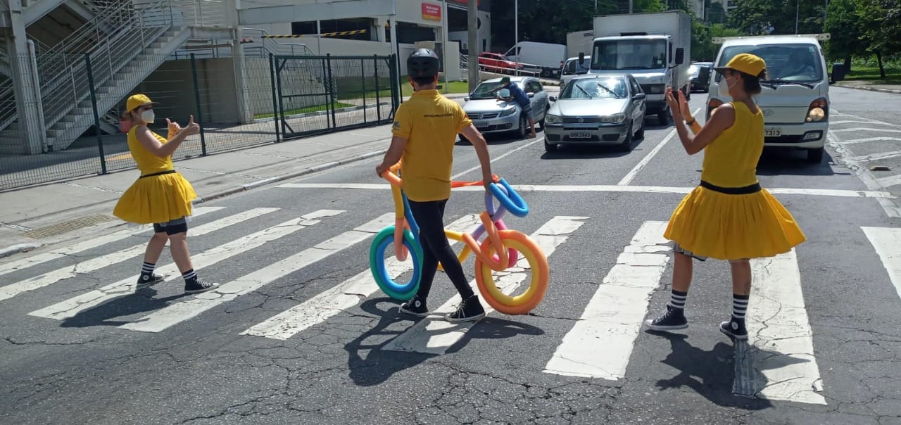 As avenidas Benjamin Harris Hunnicutt, Salgado Filho e vias adjacentes receberam ação educativa da Prefeitura de Guarulhos para motoristas, passageiros e pedestres nesta terça e quarta-feira (dias 22 e 23). A intervenção contou com atores profissionais caracterizados interagindo com as pessoas, uma “mão gigante” representando o movimento de ordem de parada aos condutores de veículos e também um  jingle voltado principalmente à segurança dos pedestres, que são os usuários mais vulneráveis do trânsito.