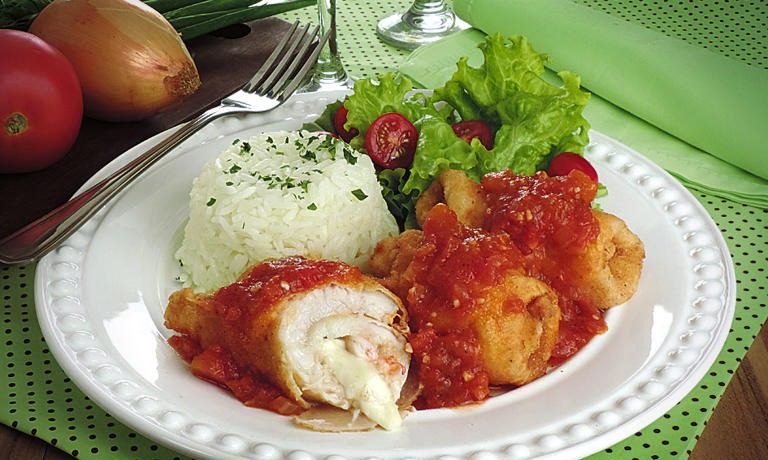 Tempere o linguado com o tempero para peixe e o suco de limão. Reserve. Para o molho, em uma panela, em fogo médio, aqueça o azeite, e refogue a cebola e o alho por 3 minutos ou até murchar. Adicione os tomates, o caldo, o louro e tempere com sal e pimenta. Cozinhe por 5 minutos, em fogo baixo. Retire do fogo e reserve. Coloque uma tira de mussarela e um camarão sobre cada filé de peixe. Enrole como rocamboles e feche com palitos, inclusive as laterais para o recheio não escapar. Passe pela farinha de trigo, pelos ovos e empane na farinha de rosca. Em uma panela, em fogo médio, coloque o óleo e frite os rolês, aos poucos, até dourar. Escorra sobre papel-toalha, deixe amornar e retire os palitos. Cubra com o molho de tomate. Sirva, se desejar, acompanhado de arroz branco e salada.