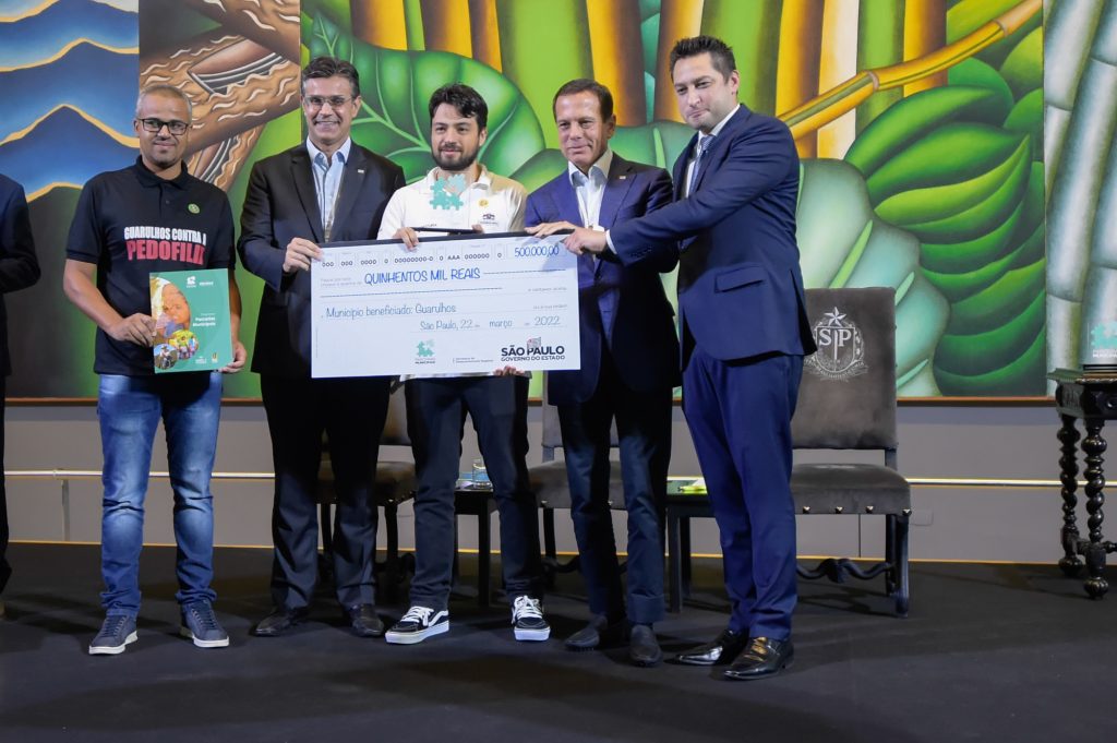 A Prefeitura de Guarulhos recebeu a condecoração “Cases Inovadores 2022”, do programa estadual Parcerias Municipais, pelo trabalho de prevenção e combate à violência sexual desenvolvido por meio do projeto Guarulhos Cidade que Protege. Na última terça-feira (22) o prefeito Guti recebeu o prêmio de R$ 500 mil, que será repassado ao município por meio de convênio com o governo estadual, em cerimônia realizada no Palácio dos Bandeirantes, em São Paulo.
