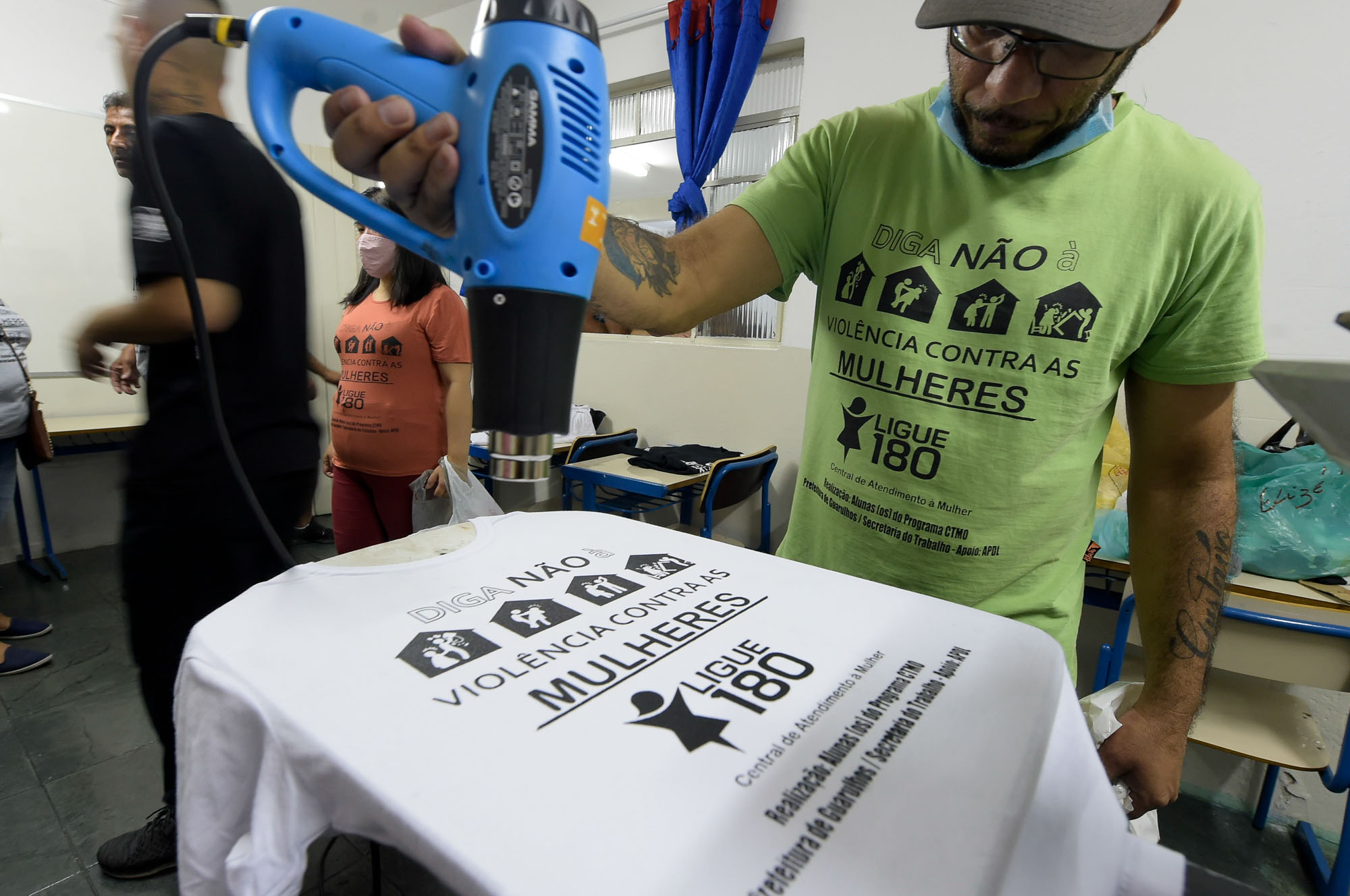 Os alunos de serigrafia do Centro de Treinamento e Mão de Obra (CTMO) de Guarulhos aproveitaram os ensinamentos das aulas para aplicarem em prol do bem e da conscientização. Nesta quarta-feira (30), em parceria com os alunos do curso de marketing, eles promoveram uma ação para chamar a atenção dos estudantes dos demais cursos na luta contra a violência doméstica. Eles estamparam cerca de 250 blusas, trazidas pelos alunos, com a frase “Diga não à violência contra a mulher. Disque 180”.
