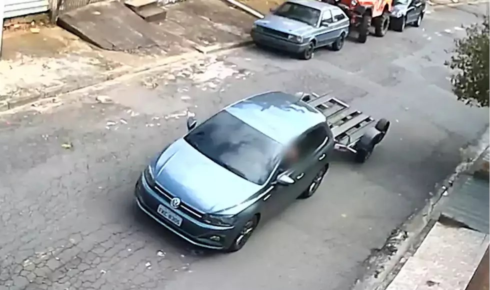 A vítima foi abordada por dois homens, que entraram em seu carro. Imagens de segurança registraram o momento que um dos criminosos deixa o veículo correndo. Ele conseguiu pegar a arma da vítima e fugiu.
