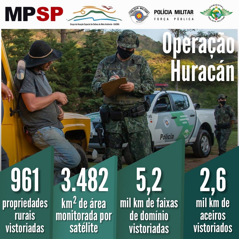 A Polícia Militar Ambiental e o Ministério Público de São Paulo, por meio de seu Grupo de Atuação Especializada em Meio Ambiente (Gaema), deflagraram, nos dias 17 e 18 deste mês, a operação “Huracán” para prevenir incêndios em todo o Estado. As atividades foram realizadas em integração à operação Sufoco e resultou na vistoria de 961 propriedades rurais, cujos responsáveis receberam orientações dos agentes.