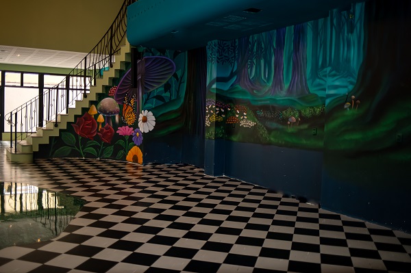 Os traços precisos e cheios de vida trazem referências do livro e reproduzem com riqueza de detalhes uma floresta com cogumelos gigantes, flores e borboletas, em uma explosão de cores e profundidade. “Foi um desafio grande porque estávamos trabalhando simultaneamente com mais profissionais no local. A preocupação e o cuidado eram para que os trabalhos das diferentes equipes pudessem fluir de forma orgânica, se complementando”, conta Erick, que completa: “É um projeto único e diferenciado”.