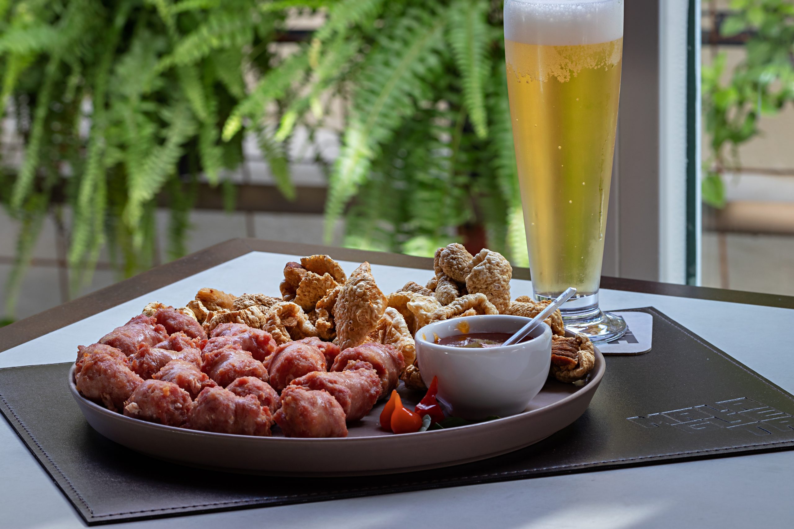 – Porção de torresminho e de linguiça caseira fritos e servidos com geléia de pimenta. Se preferir, peça nosso molho tradicional de pimenta.