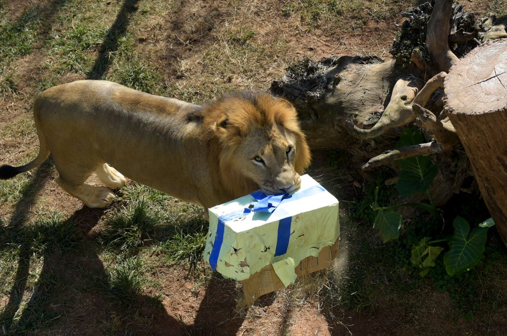Preparada com capricho pela equipe do zoo, a festinha foi parte das atividades de enriquecimento ambiental fundamentais para a saúde física e psicológica dos animais. “Aproveitamos todas as oportunidades para oferecer atrativos, que incentivam a movimentação e outros comportamentos naturais não só aos leões, mas a todos os demais habitantes do zoológico”, explica Fernanda Magalhães, diretora do parque.