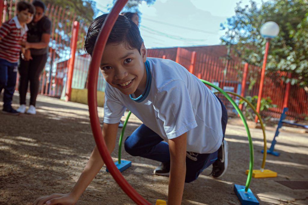 A professora da EPG, Cinthia Araújo, montou o Circuito Linha Movimento na entrada da unidade, que proporciona os desafios de equilibrar-se, saltar, agachar, passar por obstáculos e lançar argolas no alvo. As crianças se divertiram muito com a brincadeira na área externa da escola, com o apoio das estagiárias Gabriele dos Santos e Natalia Alves. A turma do AEE dessa escola envolve crianças com transtorno do espectro autista (TEA) e síndrome de Down.
