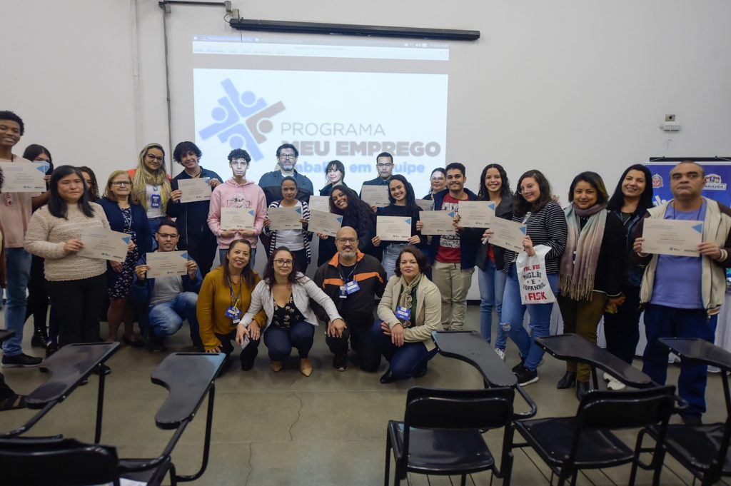 “Mentes unidas“ e “todos somos um” são os lemas das duas turmas que se formaram na manhã desta terça-feira (31) no curso Meu Emprego – Trabalho em Equipe, programa que auxilia jovens e adultos na recolocação no mercado do trabalho por meio de orientações sobre elaboração de currículo e preparação para entrevistas de emprego. Além da parte teórica do curso, os 20 formandos também puderam, durante os 12 encontros que ocorreram nas últimas semanas, dialogar e refletir sobre sonhos, projetos, confiança e amor próprio em dinâmicas que incentivaram o crescimento pessoal.
