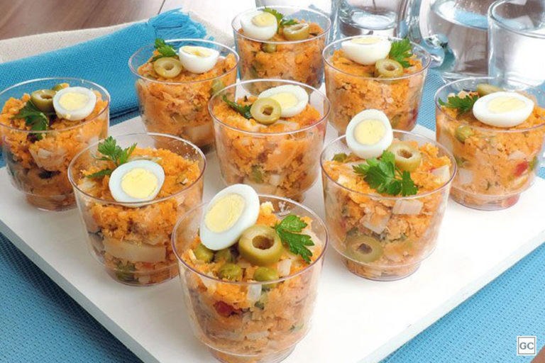 Distribua entre copinhos individuais transparentes, decore com uma rodela de azeitona, metade de um ovo de codorna e ramos de salsa.