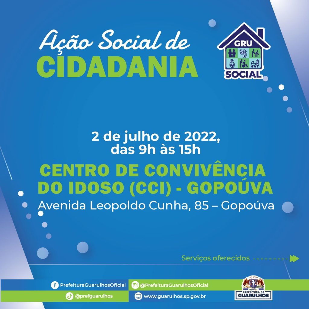 O Centro de Convivência do Idoso (CCI) Gopoúva receberá no próximo dia 2 de julho (sábado) o GRU Social, uma ação de cidadania promovida pela Prefeitura de Guarulhos que oferece diversos serviços gratuitos à população. O evento acontecerá das 9h às 15h na avenida Leopoldo Cunha, 85.