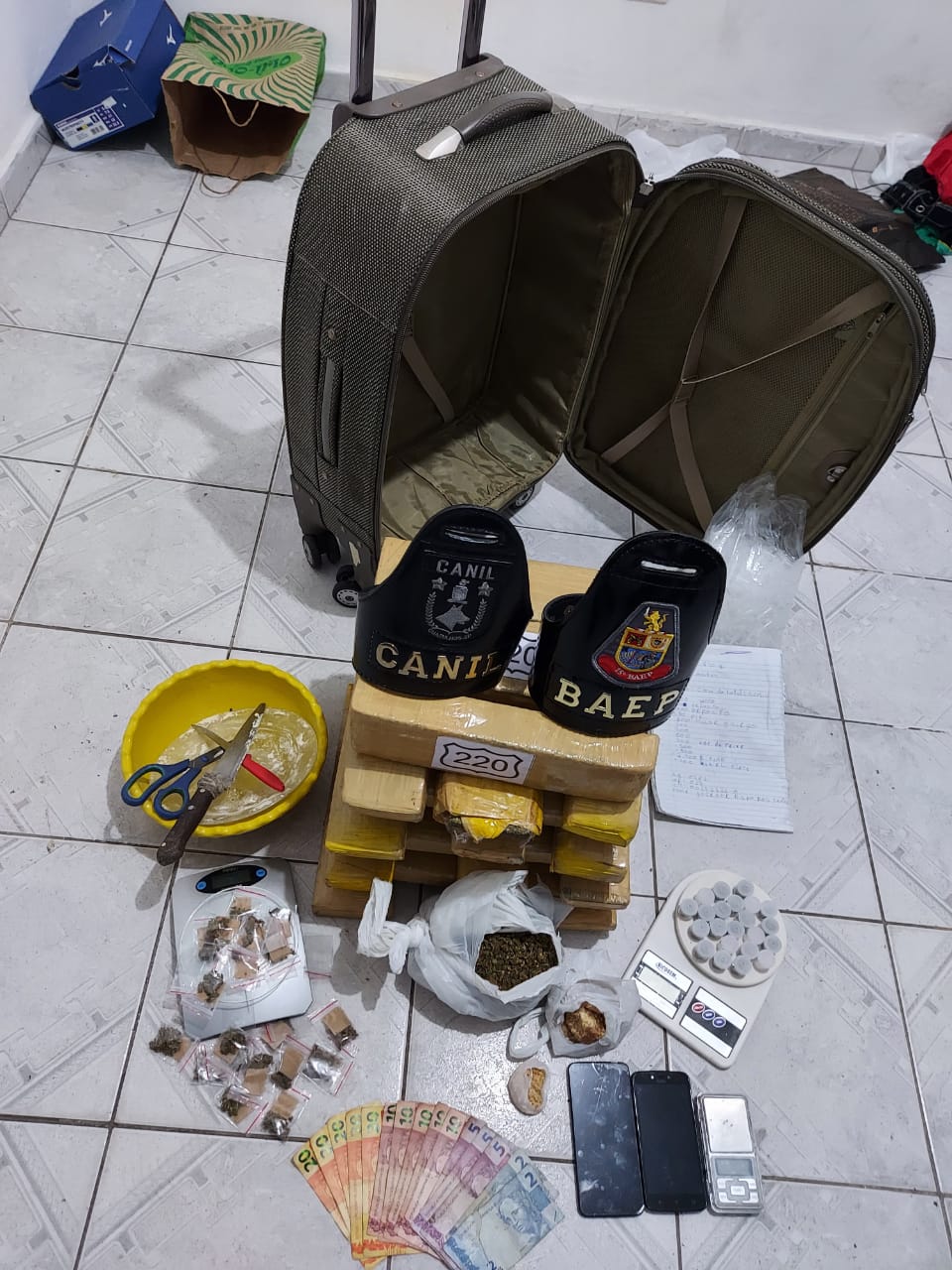 Ventania, inquieto com a situação, direcionou os agentes ao interior do imóvel, com entrada autorizada pelo proprietário. Em um dos quartos da residência foram encontradas duas malas de viagem que continham 19 embalagens em forma de tijolos com entorpecentes, além de três balanças de precisão, três celulares, cadernos de anotações, pen drive, centenas de pinos de plástico vazios usados para embalar cocaína e R$ 172 em espécie.