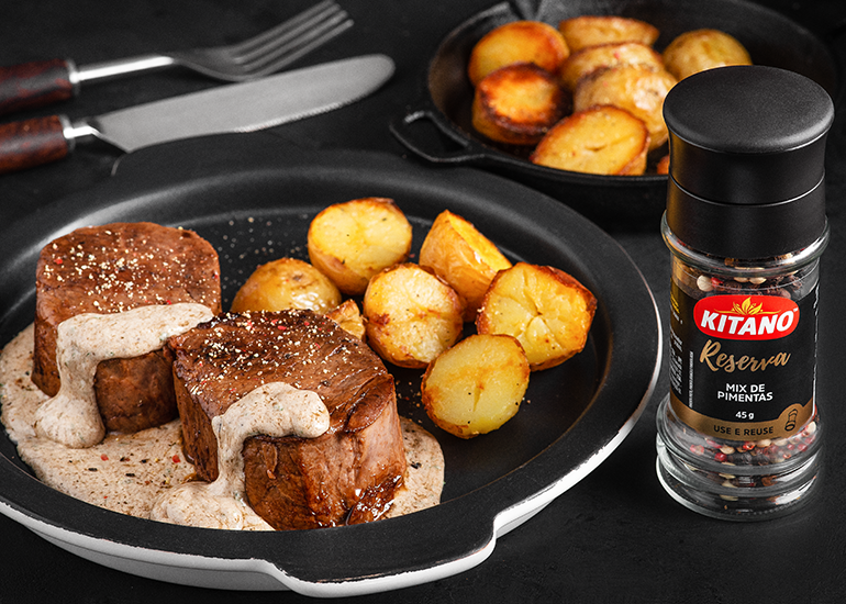 Modo de preparo: tempere a carne dos dois lados, com sal e uma camada de Mix de Pimentas Kitano Reserva. Aqueça o azeite e a manteiga e doure os filés dos dois lados e as laterais. Quando atingir o ponto desejado, retire os filés da frigideira e mantenha aquecidos. Na mesma frigideira em fogo baixo, coloque o vinho e misture com uma espátula. Acrescente o creme de leite e cozinhe até encorpar o molho. Aqueça a manteiga e doure as batatas, temperando com Mix de Pimentas Kitano Reserva. Sirva os medalhões com arroz e as batatas.