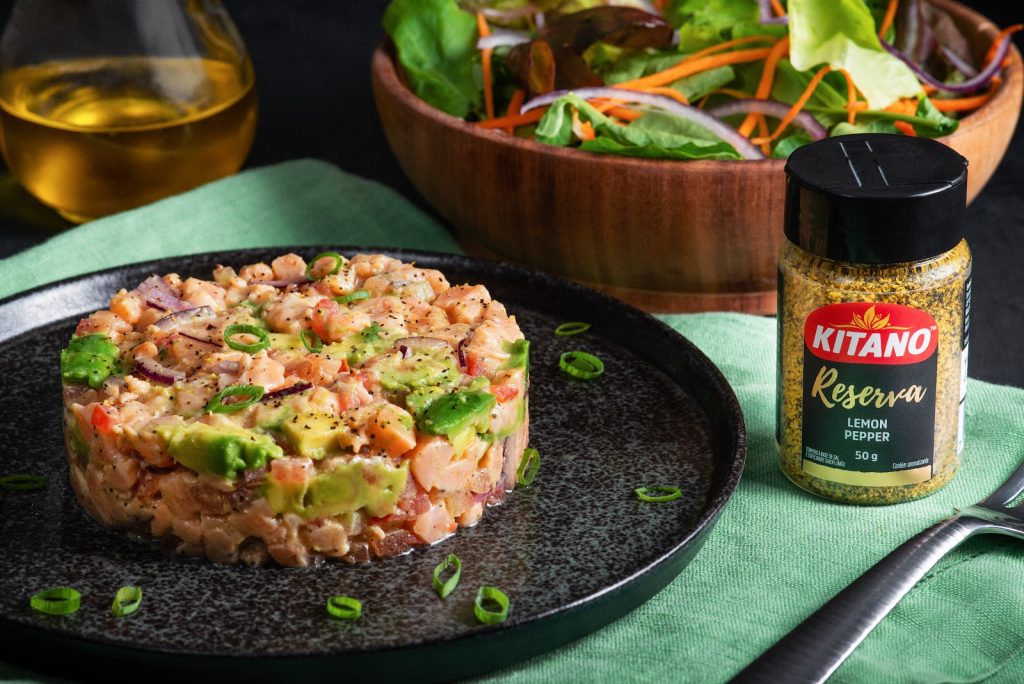 Preparado com poucos ingredientes, o diferencial dessa receita está nos detalhes, mais precisamente na escolha do tempero. O Lemon Pepper, da Kitano Reserva, carrega o frescor das raspas de limão e pimenta-do-reino que formam uma mistura excêntrica e levemente picante, ideal para transformar o paladar do salmão cru.