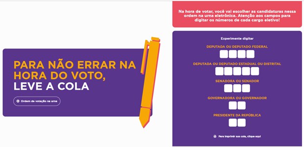 A Justiça Eleitoral incentiva a eleitora e o eleitor a levar para a cabine de votação a chamada colinha eleitoral, com os números de candidatas e candidatos escolhidos. O uso da cola no dia da eleição torna mais rápida a digitação dos números na urna eletrônica, além de contribuir para reduzir as filas de votação.