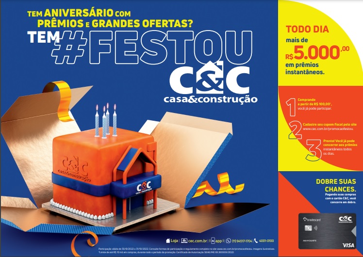 A C&C também vai sortear mais de R$ 5 mil em prêmios todos os dias. A cada R$100,00 em compras o cliente concorre a prêmios diários no valor de R$500,00, basta se cadastrar no site www.cec.com.br/promocaofestou, preencher o formulário com os seus dados e a nota fiscal. Além disso, comprando pelo Cartão C&C, o cliente concorre em dobro aos prêmios, podendo ainda parcelar suas compras em até 12 X sem juros ou em 24 parcelas fixas. Quem quiser fazer o Cartão C&C e aproveitar as vantagens do mês, basta procurar um funcionário nas lojas, no mês de aniversário, a anuidade é gratuita.