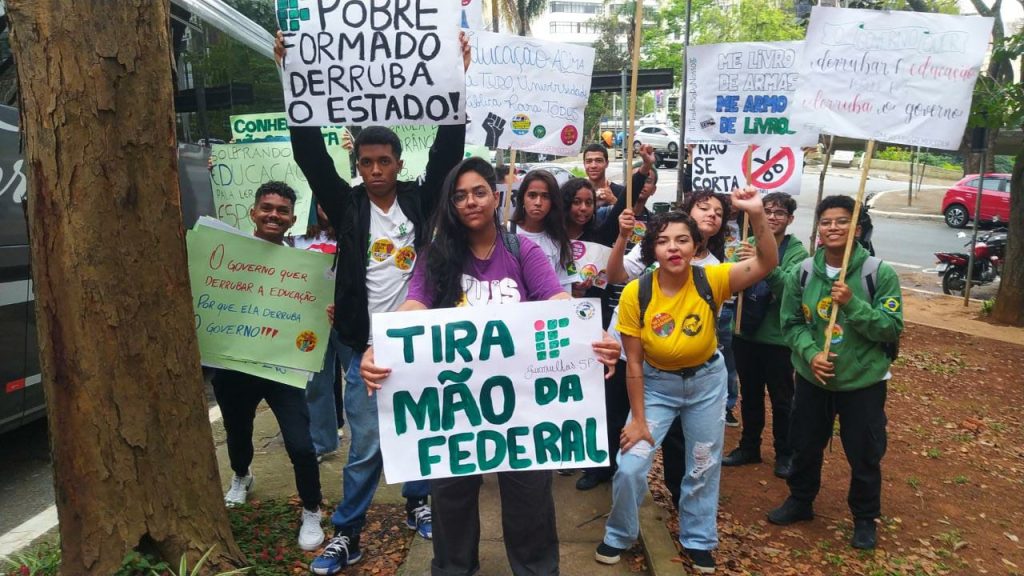 “Estamos aqui para pressionar o MEC a reconstituir o orçamento dos institutos federais e universidades públicas que vêm sofrendo cortes desde maio. O MEC voltou atrás com o confisco de 3,1 bilhões de reais da última semana, mas na nota não tem nada sobre as escolas públicas”, observou Sarah Rachel Paulino Andrade, coordenadora da UJS Guarulhos.