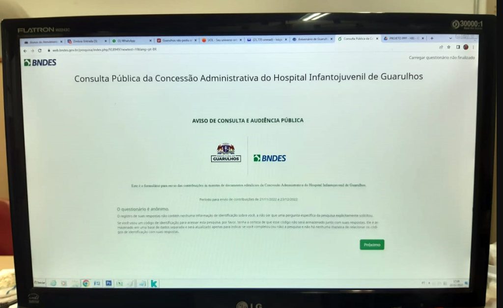 A Prefeitura de Guarulhos disponibiliza uma consulta pública online para que empresas e a sociedade civil conheçam o projeto referente à concessão administrativa para a construção, equipagem, operação e manutenção do Hospital Infantojuvenil de Guarulhos (HIG), que objetiva otimizar a capacidade de atendimento ao público de até 19 anos pelo Sistema Único de Saúde (SUS) do município.
