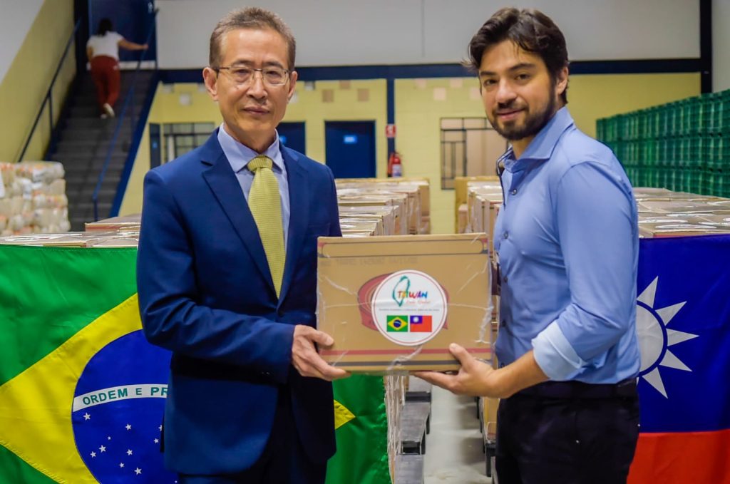 O prefeito Guti recebeu nesta terça-feira (29), ao lado da presidente do Fundo Social de Solidariedade (FSS), Elen Farias, a doação de 650 cestas básicas para Guarulhos do Escritório Econômico de Taiwan por meio do programa Taiwan Can Help (Taiwan pode ajudar).
