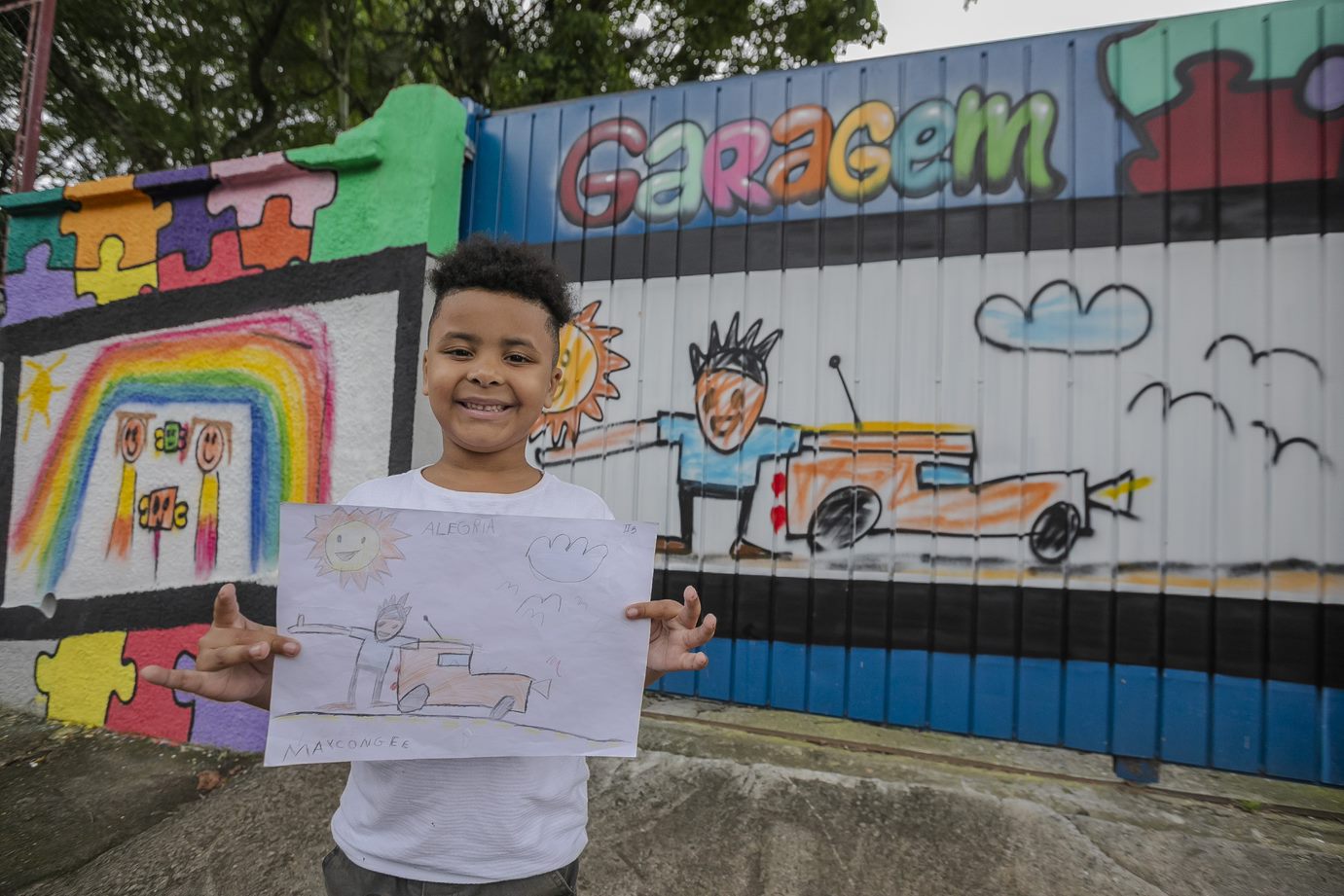 O entusiasmo do aluno Maycon Gee Oliveira, de seis anos, contagiou toda a família assim que ele avistou o seu desenho no portão da garagem da EPG. “Quando estava passando na frente da escola vi o meu desenho e mostrei para todos. Eu desenhei o carro do meu pai e eu. A pintura no muro ficou igual”, disse Maycon, que atualmente está no 1º ano.