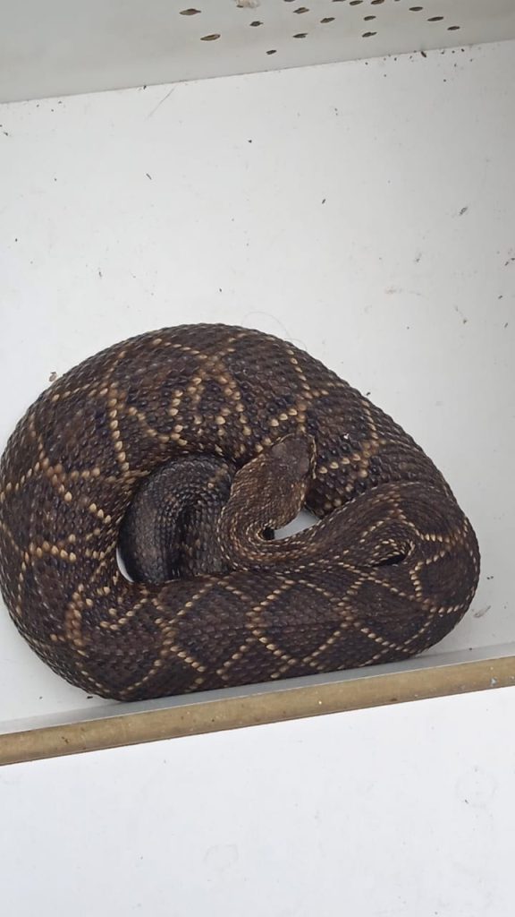 O patrulhamento ambiental da Guarda Civil Municipal (GCM) de Guarulhos resgatou uma cobra cascavel com cerca de 1,2 metro de comprimento em uma chácara no bairro Morro Grande nesta quarta-feira (1°). O proprietário do imóvel a encontrou após ouvir os latidos de seus cachorros à noite, prendeu-a sob uma caixa de plástico e acionou os agentes pelo telefone 153.