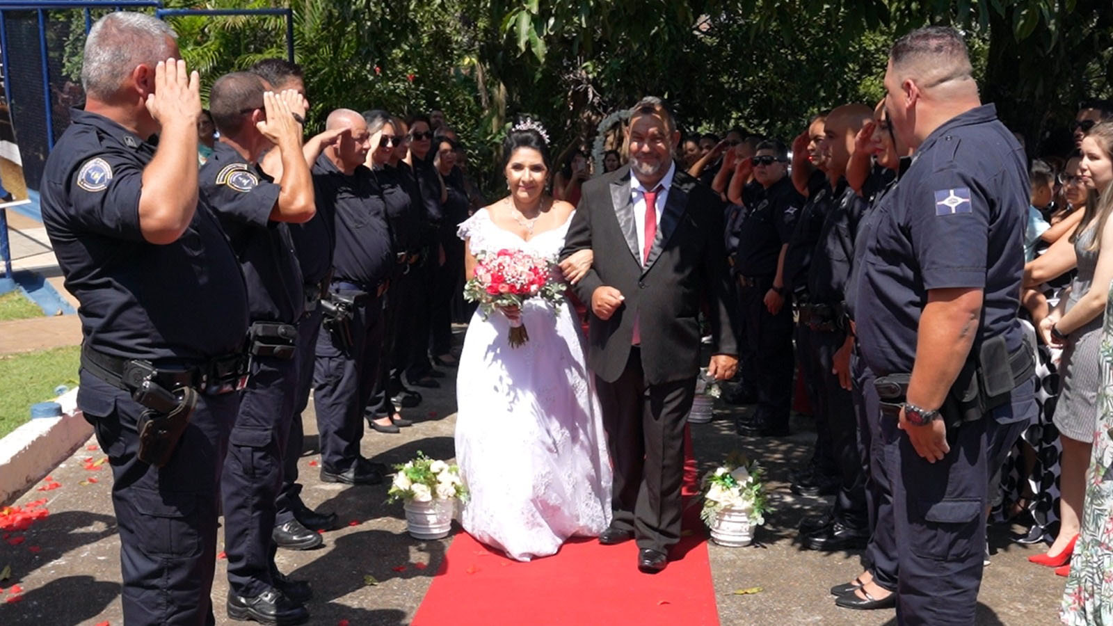 A Patrulha Maria da Penha de Guarulhos, um programa da Guarda Civil Municipal (GCM) de proteção às mulheres vítimas de violência doméstica, prestou honrarias na cerimônia de casamento de uma de suas assistidas no último domingo (26). Durante a cerimônia no Recreio São Jorge, 14 agentes alinharam-se no caminho para o altar e prestaram continência aos recém-casados. Há cerca de quatro anos a noiva Maria O. Alves libertou-se de uma relação abusiva com o apoio do serviço.