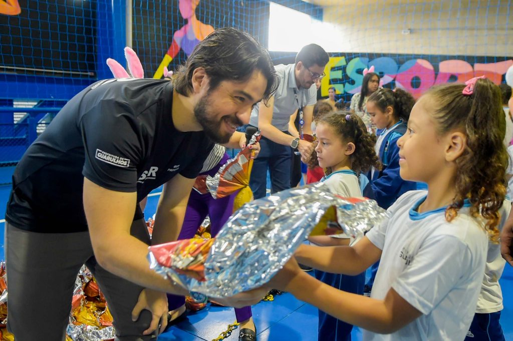 Caça aos ovos, gincanas, festa e muito, muito chocolate. A quarta-feira (5) foi marcada por grande diversão e festa nas unidades da rede de ensino de Guarulhos. O prefeito Guti participou das brincadeiras e iniciou a entrega de cerca de 119 mil ovos de chocolate de 180 gramas a todos os alunos das escolas da Prefeitura.