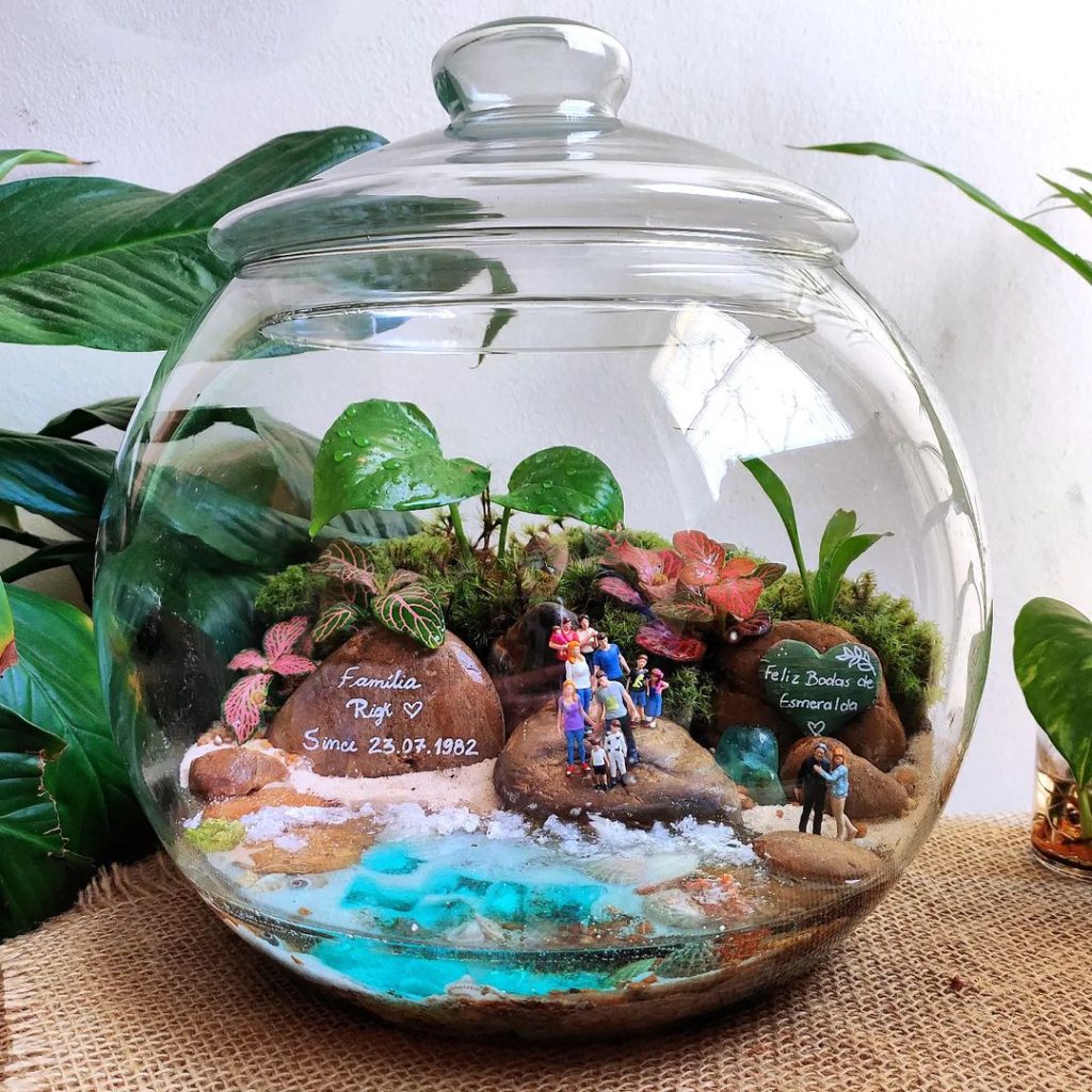 Eles podem se tornar ainda mais especiais, sendo uma forma de guardar uma memória de forma criativa. Hoje em dia, além das decorações, eles são muito utilizados como lembrancinhas em casamentos, chá revelação ou qualquer data comemorativa. Com miniaturas quase reais, eles são capazes de transmitir a emoção e o carinho presente em cada ocasião. Os terrários são uma remontagem de cenário através de uma fotografia, como é feito pela Jardim no Traço. “Nós montamos eles com miniaturas realistas da família ou momentos especiais, usando imagens como referência. Nesse caso, os cenários são feitos de acordo com o pedido, se optarem por um com estilo montanha ou balões, com rio, mar ou praia, nós temos uma variedade bem grande de opções”, conclui Carolina.