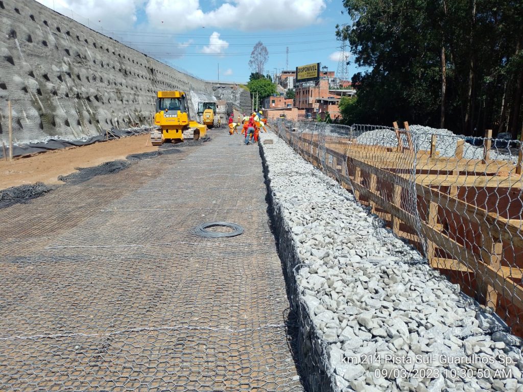 Atualmente, a obra no km 214 está na fase da execução do aterro da contenção em terramesh – tem como base o sistema de contenção por solo reforçado e a tecnologia de terra armada, desenvolvida. A contenção em terramesh fornece à obra a possibilidade de criação de taludes mais íngremes, facilidade de reforço em locais de difícil acesso e não possui necessidade de fundação específica.