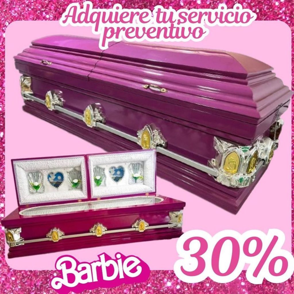 A funerário decidiu surfar na onda do lançamento do filme da boneca e anunciou nas redes sociais a venda de caixões rosa-choque, possibilitando que familiares enterrarem entes queridos em caixões de metal rosa, forrados em branco e enfeites de ouro.