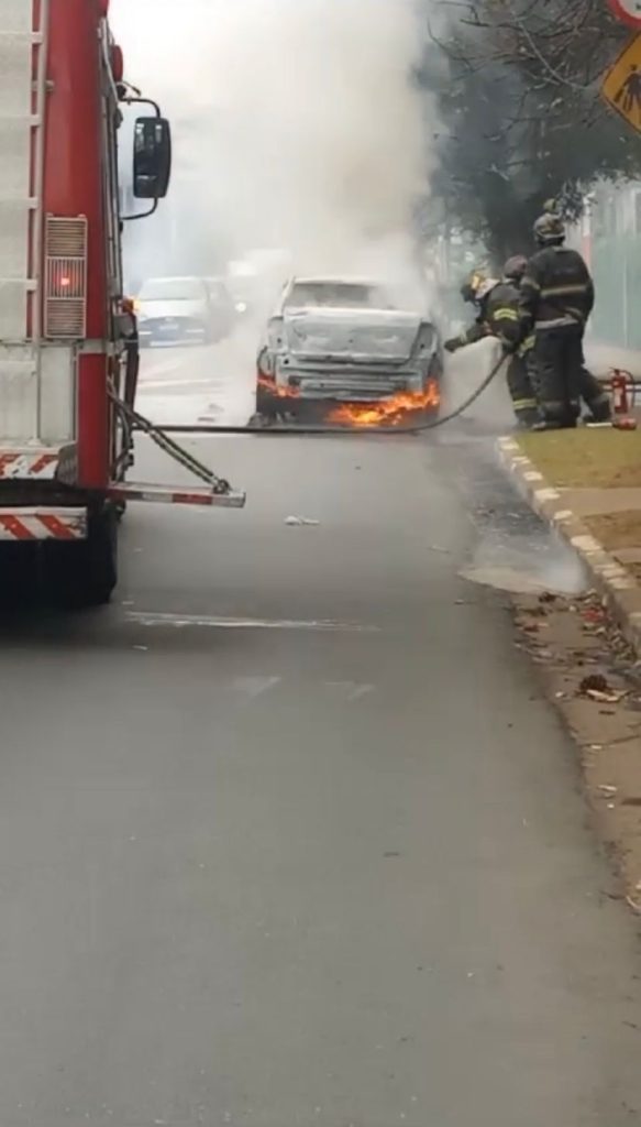Um carro pegou fogo por volta da 13h, na rua Cristóbal Cláudio Elilo, no Parque Cecap, próximo a Faculdade de Tecnologia de Guarulhos (Fatec).
