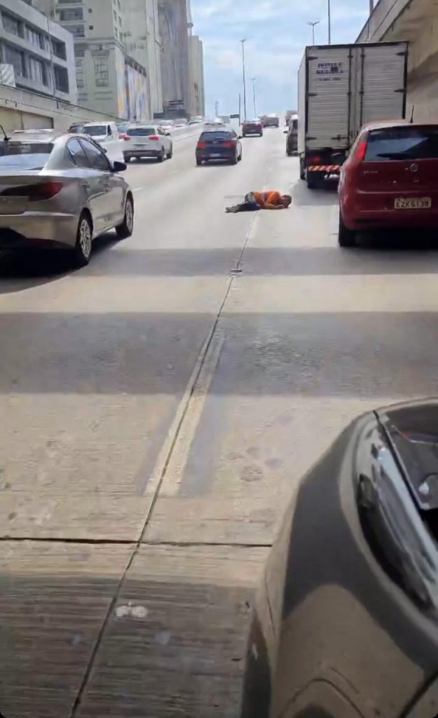O homem em situação de rua foi visto nesta quarta-feira (16) deitado no chão na saída do túnel Tom Jobim, localizado na avenida Prestes Maia, no centro de São Paulo.