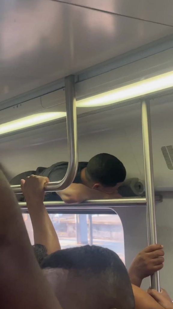 O vídeo, que viralizou nas redes sociais, mostra um jovem deitado sobre as barras de apoio de um vagão de trem, enquanto os demais passageiros se espremiam por um espacinho no local.