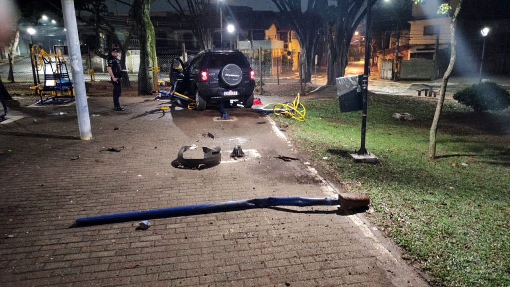 Agentes da Guarda Civil Municipal (GCM) de Guarulhos apreenderam um homem na madrugada desta segunda-feira (2) logo após acidente de trânsito com danos ao patrimônio público na praça Kasato Maru, no Jardim Almeida Prado. A equipe em patrulhamento preventivo deparou com o acidente envolvendo um veículo Ford Ecosport cinza. O condutor apresentava odor etílico e alegava que havia perdido o controle e invadido a praça, atingindo alguns equipamentos do programa Academia na Praça 60+, da Prefeitura.