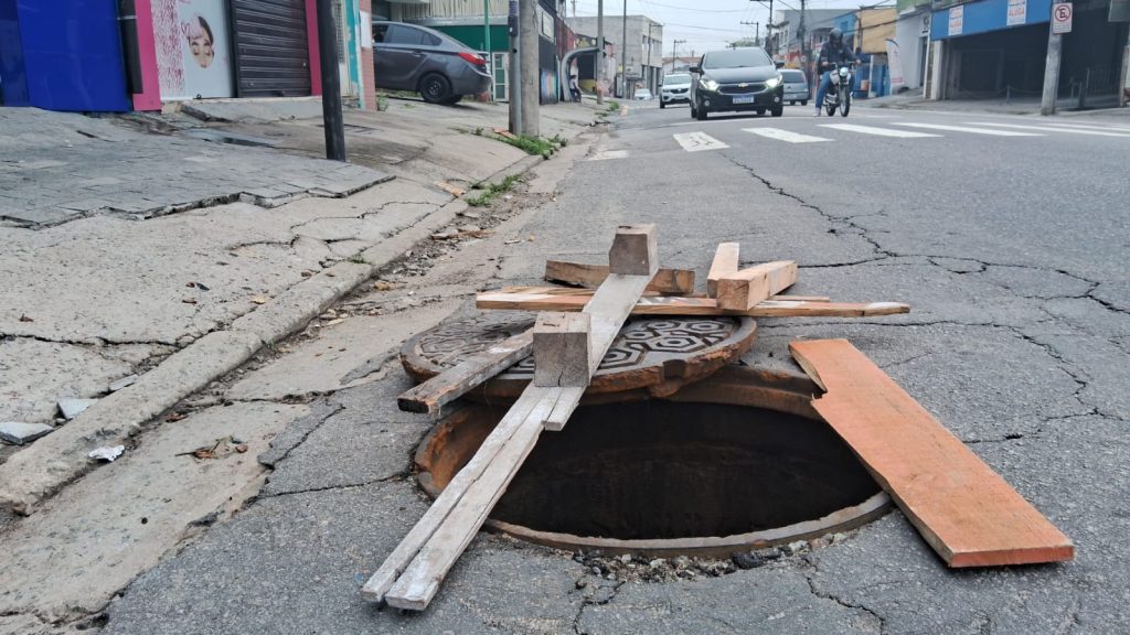 “A tampa está velha e gasta, então ela não encaixa certinho no buraco trazendo perigo na via para os pedestres e motoristas.”, um dos moradores comenta. A situação já está assim há um mês.