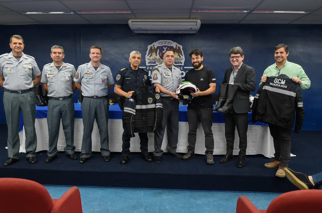 A Prefeitura de Guarulhos entregou nesta quarta-feira (18), no Paço Municipal, 216 novos equipamentos para otimizar o trabalho dos agentes da Guarda Civil Municipal (GCM) e da Polícia Militar (PM). Com o investimento proveniente do Fundo Municipal de Segurança Pública, ao todo foram adquiridos 116 capacetes escamoteáveis com óculos, 68 coturnos semi-impermeáveis com solado e proteção especiais para motociclistas, e 32 jaquetas com forro triplo, sendo um impermeável, um térmico e um de proteção corporal.