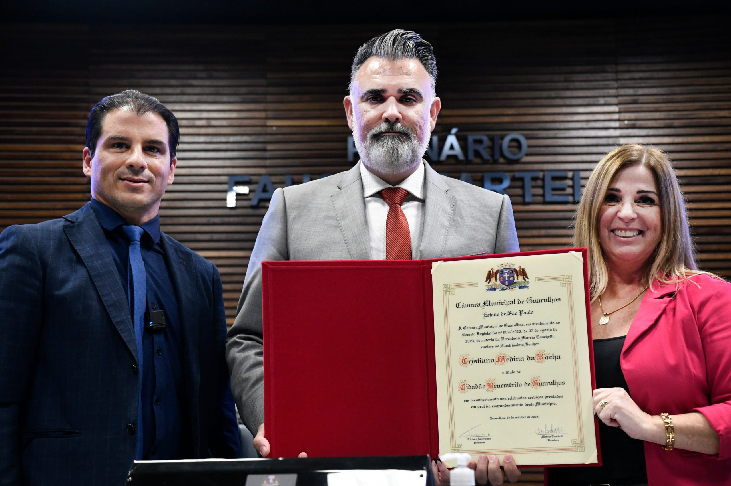 Na noite de segunda-feira (23/10), a Câmara Municipal de Guarulhos promoveu a solenidade de concessão de Título de Cidadão Benemérito a Cristiano Medina da Rocha, advogado e professor de Direito. A homenagem foi proposta pela vereadora Marcia Taschetti (PP), por meio do Decreto Legislativo n° 9, de 7 de agosto de 2023. A abertura da sessão foi presidida pelo chefe do Legislativo, Ticiano Americano (Cidadania), que passou a condução dos trabalhos para a parlamentar.