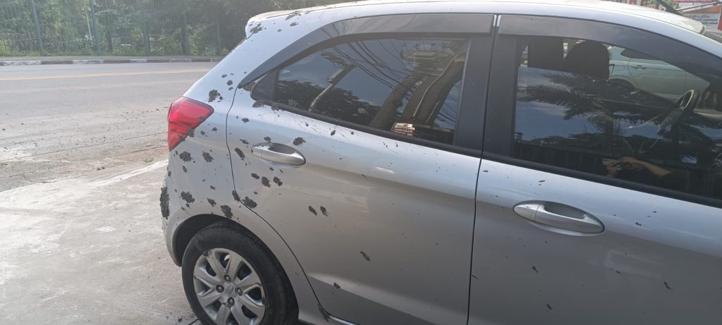 Uma mulher teve o seu carro atingido por cimento enquanto estava estacionando em um comércio da avenida Papa João XVIII, no bairro Cidade Maia. Segundo informações, as obras estavam sendo feitas no local e após um dos buracos abertos ser preenchido pelo material, não foi sinalizado, o que fez com que outro veículo passasse por ele e espirrasse sobre o carro estacionado.