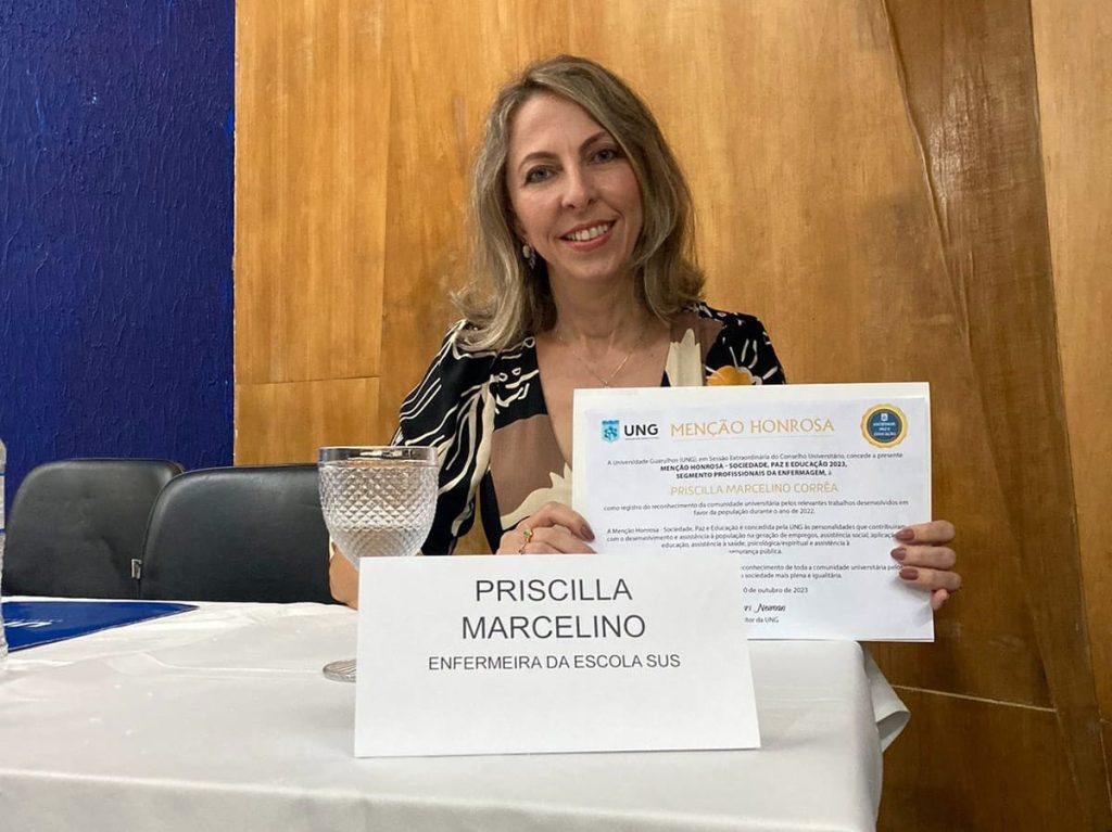 Entre os agraciados esteve a enfermeira Priscilla Marcelino, servidora do Departamento de Recursos Humanos da Saúde, na Escola SUS, que recebeu menção honrosa e fez parte da composição da mesa, sendo homenageada por sua atuação na Secretaria da Saúde de Guarulhos.